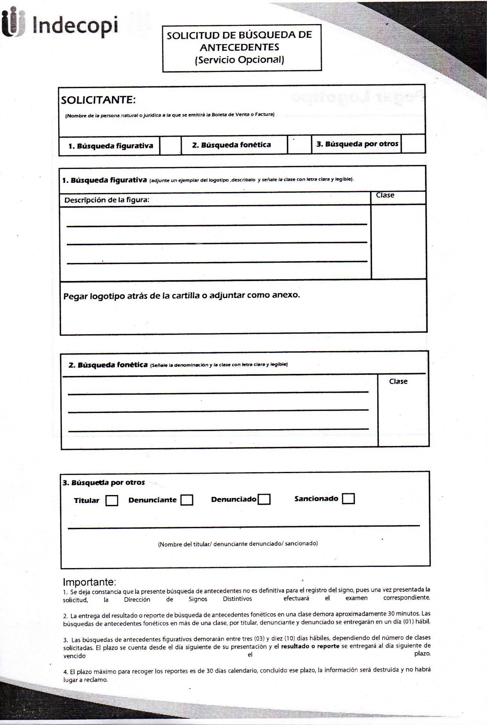 En ambos solicitudes y requisitos realizados para el registro de marca en INDECOPI es necesario adjuntar las búsquedas realizadas, de la fonética y figurativa a registrar previamente hechas, de este modo la solicitud de registro pueda tener un resultado optimo en los próximos 30 días hábiles, que es el tiempo estimado.