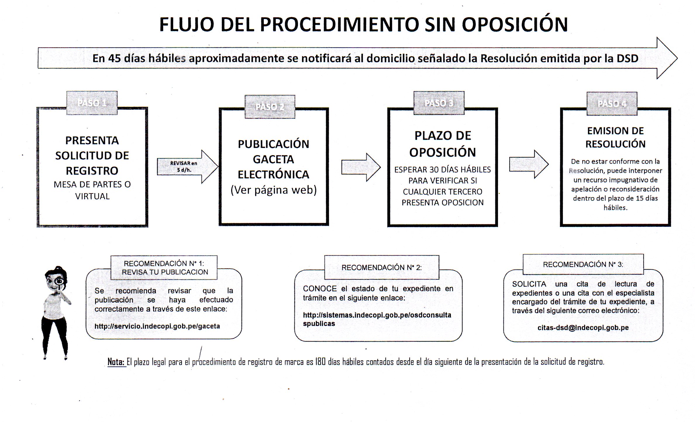 Después de haber realizado la búsqueda, solicitud y haber hechos los pagos solicitados por la INDECOPI para el registro de la marca, en los 30 días siguientes se realizará una publicación en el periódico peruano la solicitud de tu registro y si nadie se antepone en ese tiempo estimado, se dará por registrado la marca por lapso de 10 años.