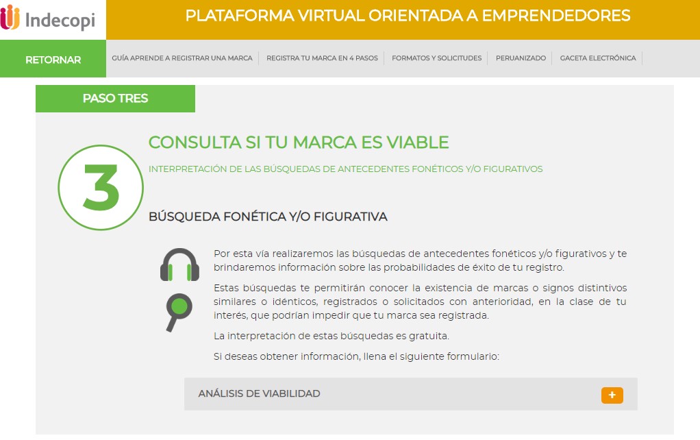 Antes de empezar con los pasos a realizarse, se debe mencionar que existen diversas herramientas digitales que permiten hacer búsquedas de marcas en los diferentes países, por ejemplo https://trademark-search.marcaria.com/es , estas misma se puede usar de modo educativo o preventivo, pero no se debe confiar, ya que la única entidad de búsquedas es la INDECOPI, aclarado este punto, pasemos a los pasos a realizar.